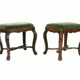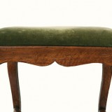 having velvet upholstered drop-in seats, with scalloped aprons, cabriole legs, curved x-form stretchers, and resting on spade feet, in very good condition with some later recarvings and splicing to feet, mostly of the period with later interior corner braces