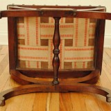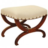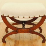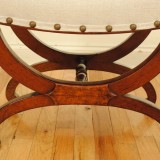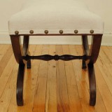 curule form stool upholstered in linen burlap with brass nailheads