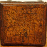 the almost square tops with curved edges and deep scratches above conforming frames, raised on turned legs joined by box stretchers and having block feet, in good condition