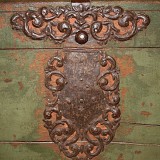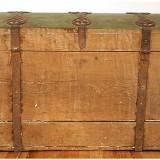 green painted with steel hardware, formerly having velvet in various areas, interior having a storage box