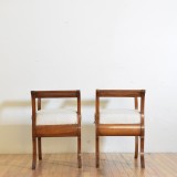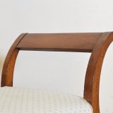 having curved backrests, each tightly upholstered seat resting on splayed legs
