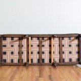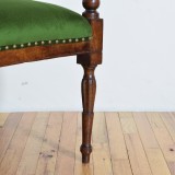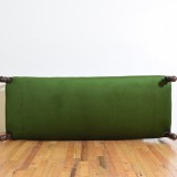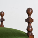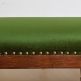 likely from the Piemonte region of Italy, the rectangular frame with raised and carved finials at the corners, raised on round carved and tapering legs, upholstered in velvet.
