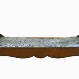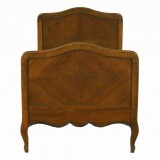 the vertical panel veneered slightly taller headboard having the same arched crest rail as the footboard, the bottoms with a serpentine, molded, and ebonized edge, the siderails also serpentine and ebonized, resting on outward cabriole legs, complete with antique bedslats and a shipping sticker "Austria".
