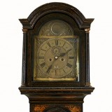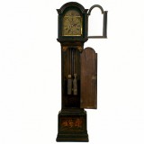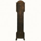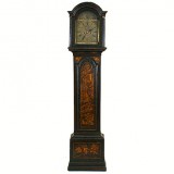 the clockworks housed within an arched and columned hinged door cabinet with glass on three sides, decorated throughout with painted chinoiserie scenes, complete with pendulum, weights, and key and in good working condition. The clockworks signed Theo Fisher, Southwark.
