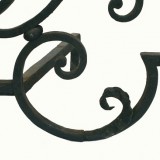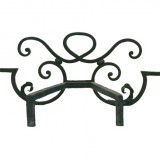 constructed of wrought iron with loops and scrolls extending horizontally with sharp finials at the ends, the one piece fire irons extending at outward angles