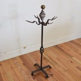 consisting of a wrought iron stand with open scrollwork details and 4 firetools: a shovel, a broom, a poker, and tongs. the stand and tools all have hammered brass finials