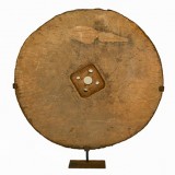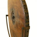 constructed entirely of a single piece of walnut, showing nail holes from a previous outer iron band as well as a bored out surface in the middle caused by an axle, with a warm patina and resting on a later custom wrought iron stand