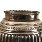 having a bead moulded top rim and a roundel pattern near the top then continuing down to the base with reeding, the bottom with hallmarks