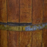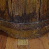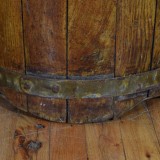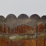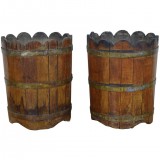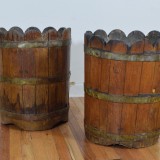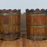 constructed from vertical planks of wood with scalloped tops and held in place by brass bands, the outer surfaces lacquered, the interiors fitted with later fiberglass liners and drilled with weep holes