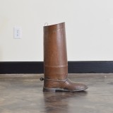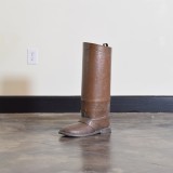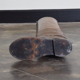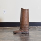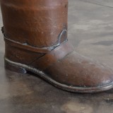 the umbrella stand in the shape of a soldier's riding boot, complete with strap detailing and spur, retaining antique patina