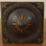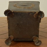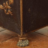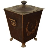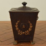 Of square tapering form, the removable top with a finial, Greek key and star painted decorations, the side with handles and painted wreaths and busts in profile, raised on cast painted metal feet.