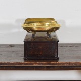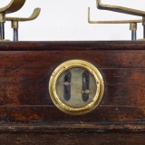 In working condition and having two removable brass trays, one round and one square, both with letter markings in the brass, the case housing the internal works and having round portal windows with arrow measures, the case also marked with lettering, includes original brass weights.