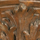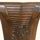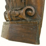 having carved volutes and a segmented upper ribbed upper area, descending and tapering to a leaf-carved section and terminating in a pair of upward volutes and a two-piece flat base, possibly the corner piece of a massive frame