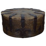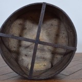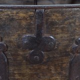 Of cylindrical form and constructed of two pieces of wood it is reinforced with iron bracing and decorated overall with iron scrolls and trefoils as well as bound by iron straps, the function was to provide an official measure of grain, the small piece of wood tucked in the inside seam bears an official seal, approval that the measure is correct.