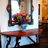 of typical Baroque form and having conforming fruit topped covers, the later painted porcelain urns depicting scenes of nobility at leisure with villas painted on the tops and bases, painted in a blue tint with yellow fruit and green leaves and an assortment of green painted trees