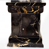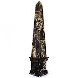 the black, white, and ocre veined marble carved into obelisks with mouldings at bases