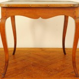 the square top having rounded edges and covered in a green and gold stenciled leather top, the molding on top attached with brass nailheads, the case having a shaped apron, one drawer, and raised on cabriole legs, in excellent condition