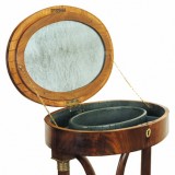 having an oval hinged top opening to a fitted interior, raised on columnar supports joined by C-scroll brackets, set on disc feet. In excellent antique condition, some veneer patching, slight warping to left side of top but top is level.