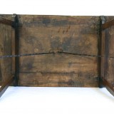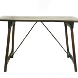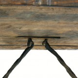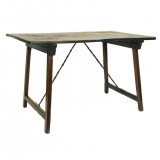 the rectangular top above hinged brackets on slightly splayed legs joined by twisting iron rods, the rods unhooking to allow the table to fold for transport or storage