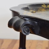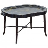English scalloped papier mâché hand-painted and gilt decorated tray faux bamboo table stand.