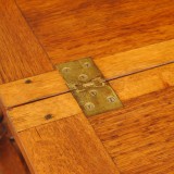 the rectangular top opening to rest on slides and make a larger surface, raised on turned legs joined by a rectangular box stretcher, resting on flattened bun feet, in excellent condition