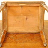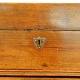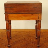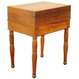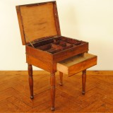 the hinged rectangular top opening to reveal assorted compartments for paint storage, the upper portion removable to reveal a bottom section accessible by a front drawer, the whole raised on turned legs and ball feet, in excellent condition, the interior with paint remnants, structurally sound
