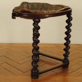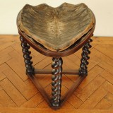 The unlaquered shell atop a custom stand raised on spiral turned legs and joined by a triangular stretcher resting on compressed bun feet.