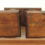 Having square tops supported on turned columns with campana form bases on graduated plinths, all raised on square frames with bracket feet