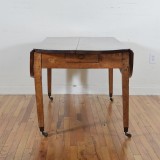 The rectangular top flanked by two drop leaves when extended forming an elongated oval, the case housing one drawer and four pull-out supports for leaves, raised on square tapering legs with original brass castors, listed measurements are for table fully extended. The depth of the table, when leaves folded down is 31 inches, each drop-leaf measures 12.5 inches.