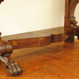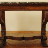 the rectangular marble top having rounded front corners atop a case housing a hidden drawer, straight rear supports and scrolled front supports ending at a lower shaped level and resting on well carved paw feet, in excellent condition