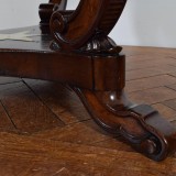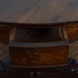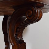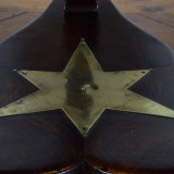The round top above a deep apron housing three concealed drawers, the top is raised on Baroque style scrolled legs, the lower triangular section having an interesting brass star with three elongated points, raised on scroll feet.