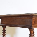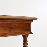 Probably from the Piemonte region of Italy this table has a rare and unique specimen marble top centered between walnut edges, the apron is drawer-less and is raised on legs with specialized turnings in that they taper to more slender before becoming larger in diameter, the stretchers are rectangular.