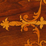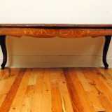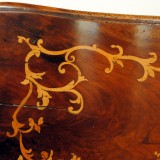 the molded edge top of serpentine form and beautifully inlaid with fruitwood resting on a conforming inlaid frame with shaped apron, raised on elegantly curving cabriole legs and slightly raised feet
