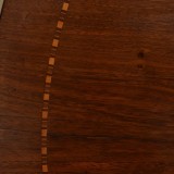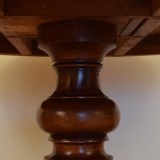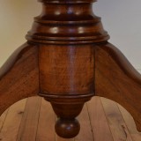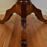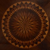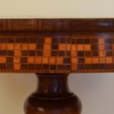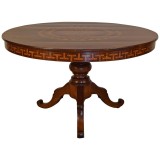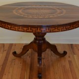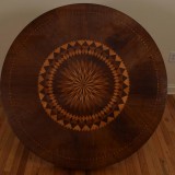 The circular top having a beautifully inlaid large center medallion with an outer gap-banded detail, the apron very unique in its geometric pattern raised on a turned columnar support with a tripartite base and shaped feet, 2nd Quarter of 19th century.